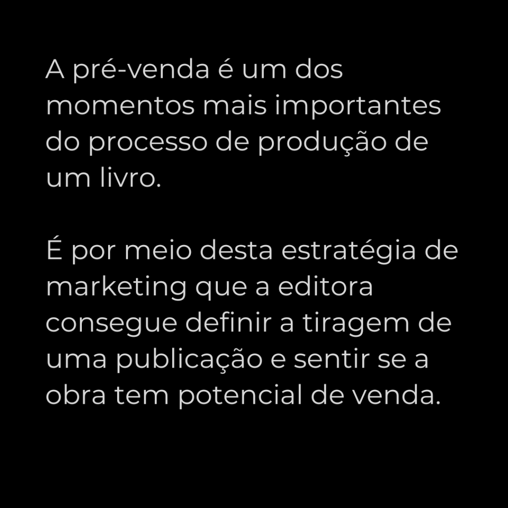 A pré-venda é um dos momentos mais importantes do processo de produção de um livro. É por meio desta estratégia de marketing que a editora consegue definir a tiragem de uma publicação e sentir se a obra tem potencial de venda.