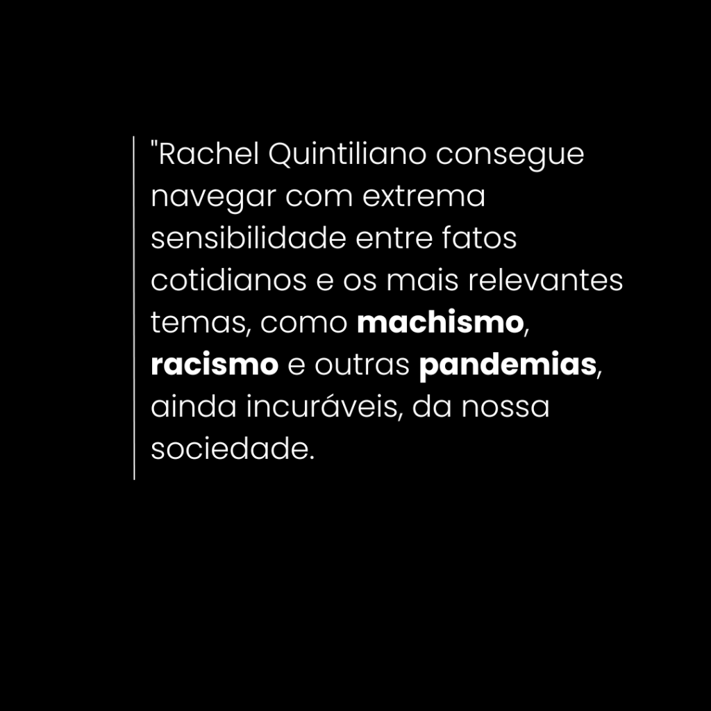 Rachel Quintiliano consegue navegar com extrema sensibilidade entre fatos cotidianos e os mais relevantes temas, como machismo, racismo e outras pandemias, ainda incuráveis, da nossa sociedade. O refinamento e a autenticidade da autora nos mostram outros caminhos como o da esperança de futuro em um período de tantas tristezas e incertezas.